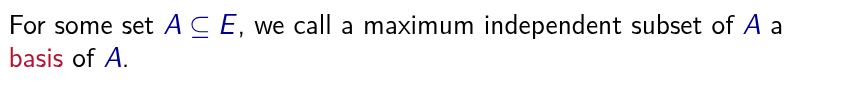 Ein Unabhängigkeitssystem ist ein Paar , wobei eine Grundmenge ist und die unabhängigen Mengen beschreibt. Es gelten: