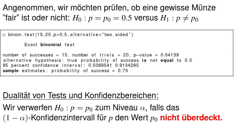 Vorraussetzungen Ja, Nein Ergebnis n unabhängige Versuche Du kennst den theoretische Verteilung p Hypothesen H0:p=p0 und H1:p=p0 (zweiseitig) H1:p>p0∨p<p0 (einseitig) Binomialverteilung berrechen P(X=x)=(xn)⋅px⋅(1−p)n−x p-Wert berrechen zweiseitig p-Wert=P(X≤x)+P(X≥(n−x)) einseitig p-Wert=P(X≤x) oder p-Wert=P(X≥x) Test verworfen wenn p-Wert<a z.B. a=0.05