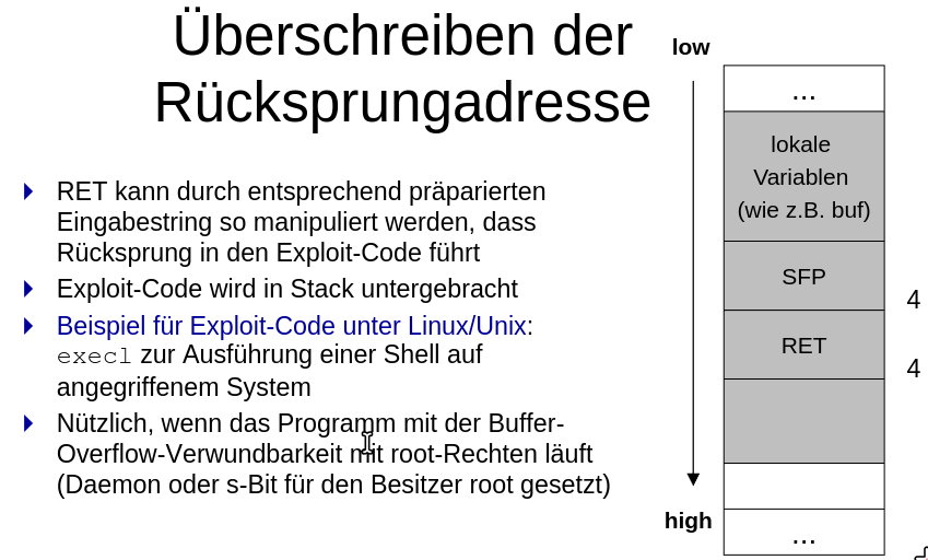 Die meisten Computer Viren/Würmer nutzten Buffer-Overflows aus (Morris-Wurm, Code Red, Blaster)