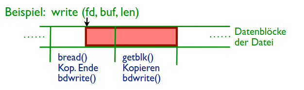 - getblk (dev, blkno) Puffer reservieren (später unter (dev,blkno) ablegen) ⇒ bei write()