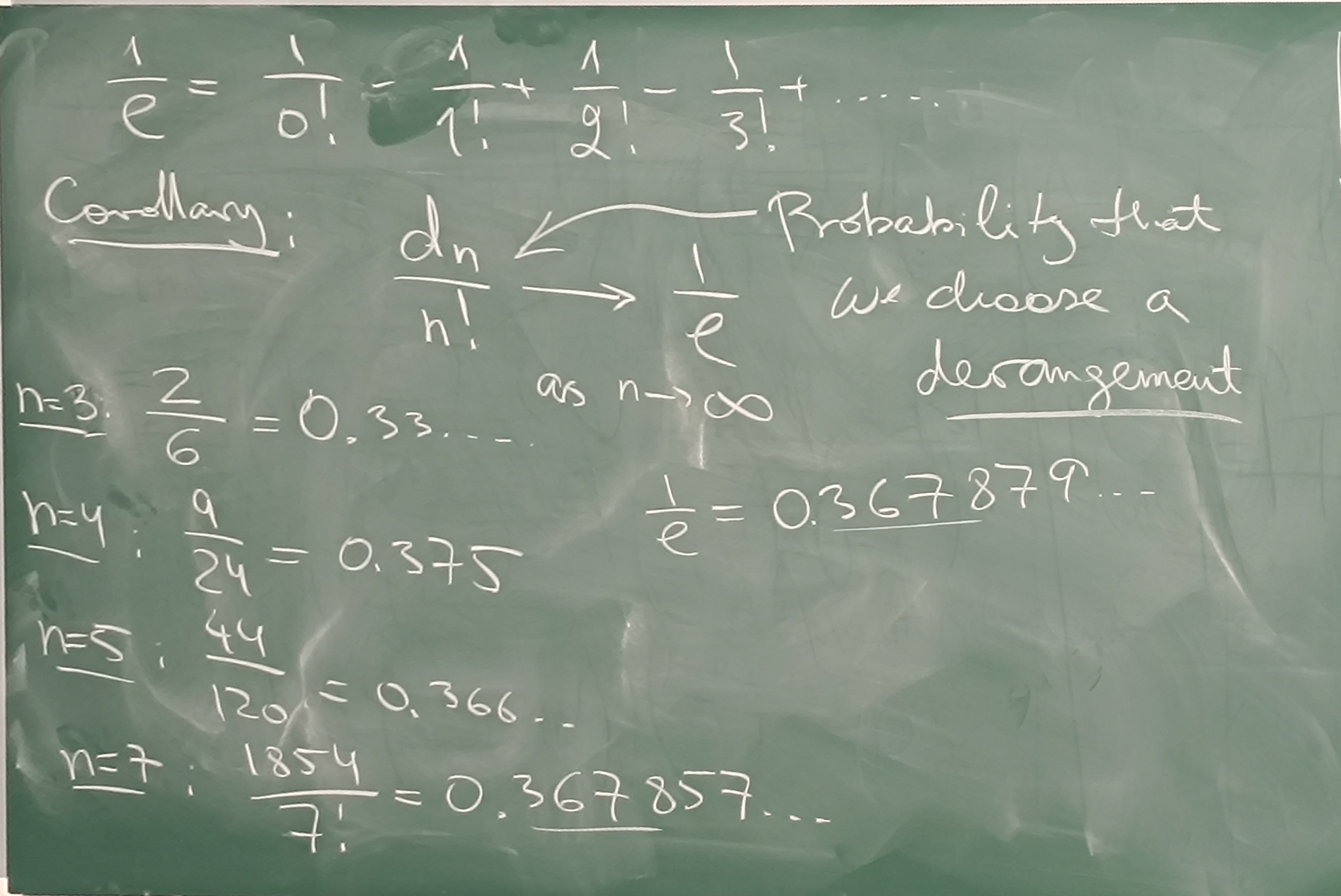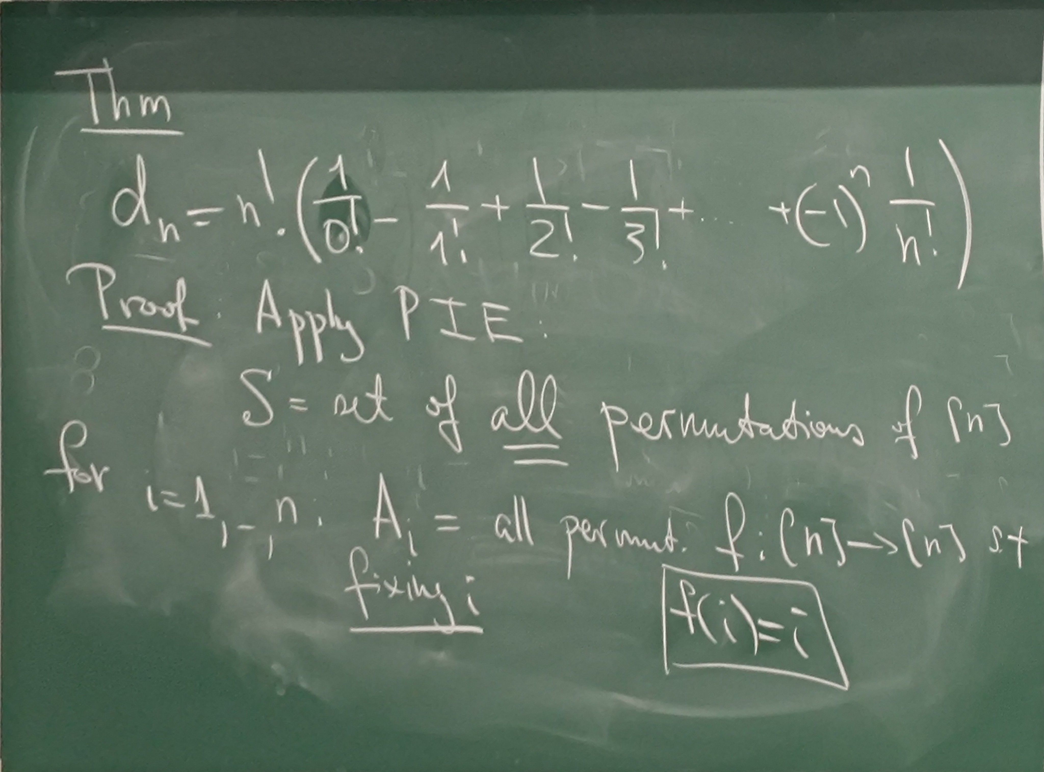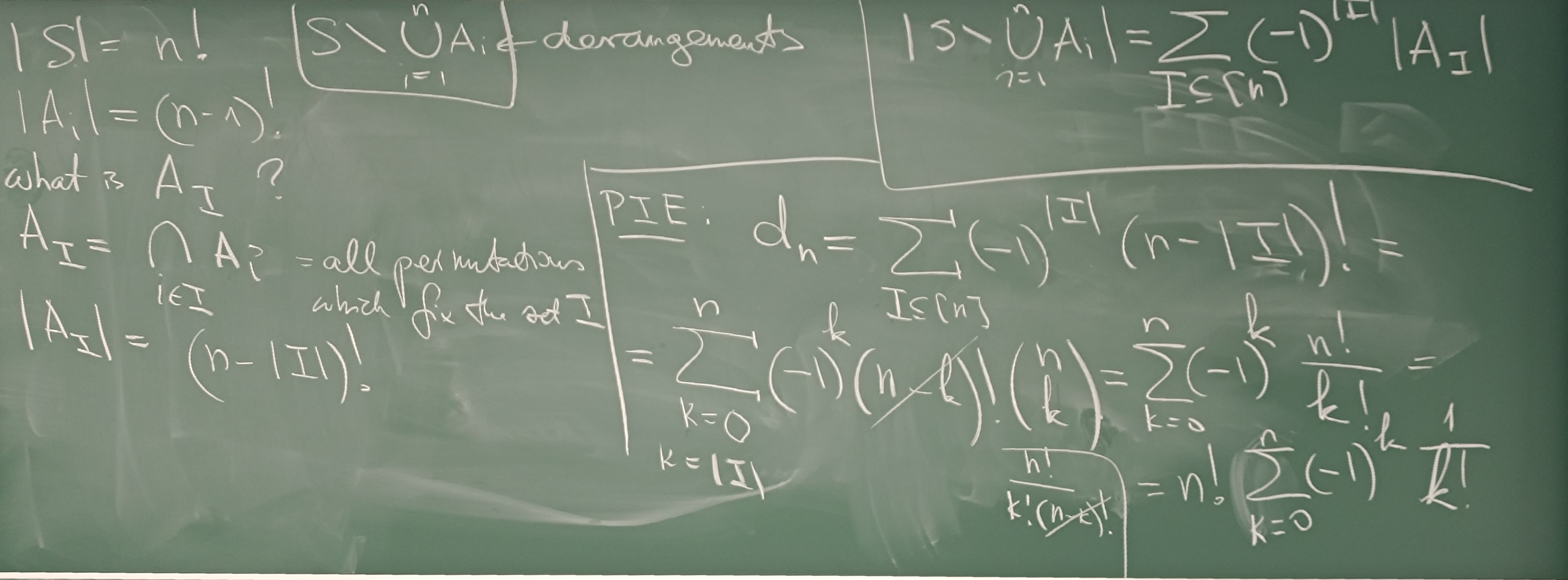PIE Menge der Permutationen wo kein Element an dem Index seines Wertes steht. dn=n!(0!1−1!1+2!1−3!1+...+(−1)nn!1)