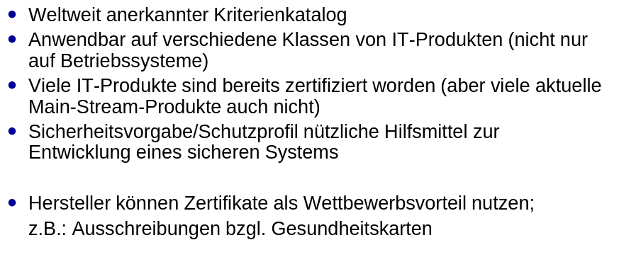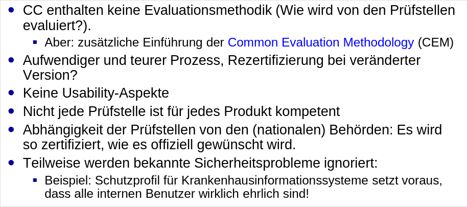 Weiterentwicklung von ITSEC Vorteile Probleme Struktur der CC-Dokumente Teil 2 Teil 3 Vertrauenswürdigkeitsstufen Schutzprofil Sicherheitsvorgaben Beispiel