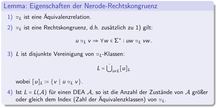 Eine Sprache ist regulär genau dann, wenn Die Nerode-Rechtskongruenz einen endlich Index hat.
