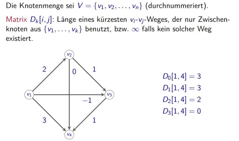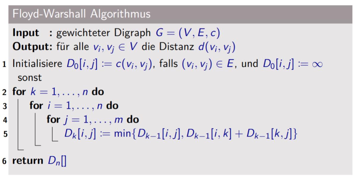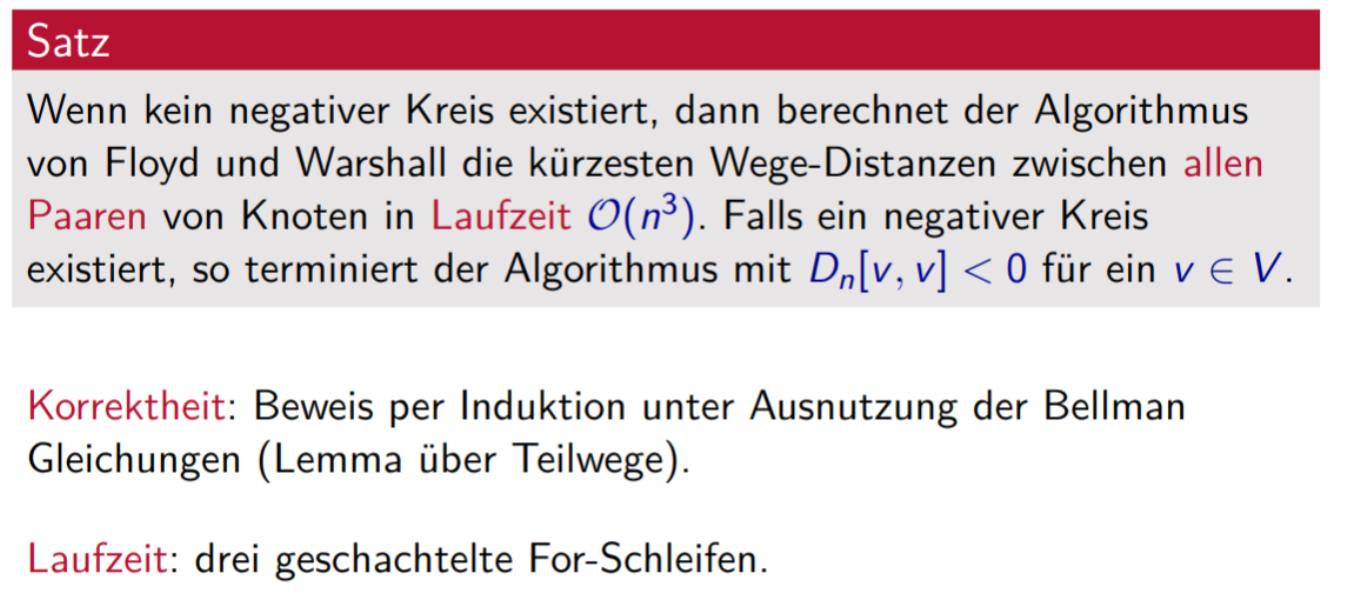 Finde kürzesten Weg zwischen Knoten u und v für alle u, v ∈ V . Wir könnten den Bellmann-Ford Algorithmus n mal anwenden (jeden Knoten v ∈ V einmal als Startknoten s): Laufzeit O(n2m). Besser: Dynamische Programmierung Beispiel alg10-DPs-2_handout-1.pdf