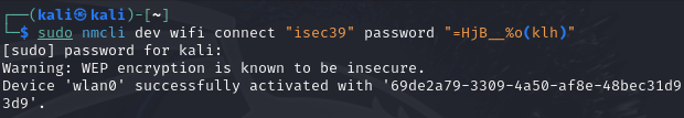 sudo nmcli dev wifi connect "isec39" password "=HjB__%o(klh)"