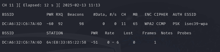 sudo airodump-ng -c 11 --bssid DC:A6:32:C6:7A:6D -w psk wlan0