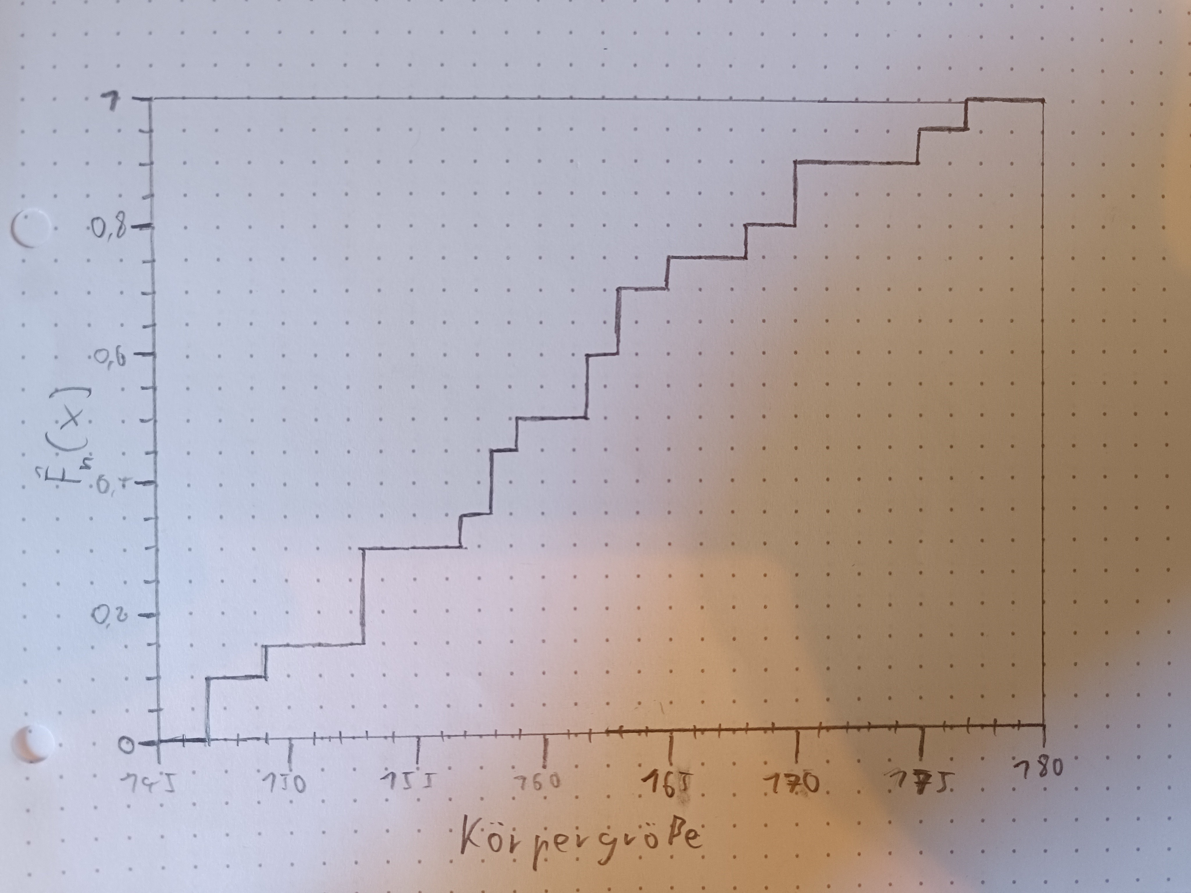 Die empirische Verteilungsfunktion ist stückweise konstant und steigt bei jedem Wert um an.