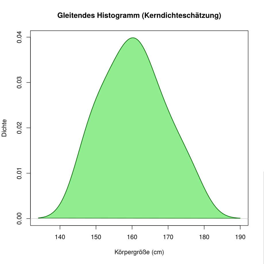 xlab = "Körpergröße (cm)", ylab = "Dichte", col = "darkgreen", lwd = 2)