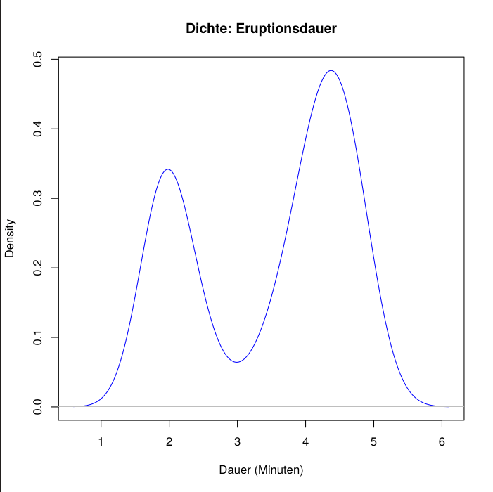 plot(density(faithful$eruptions), main = "Dichte: Eruptionsdauer", xlab = "Dauer (Minuten)", col = "blue")