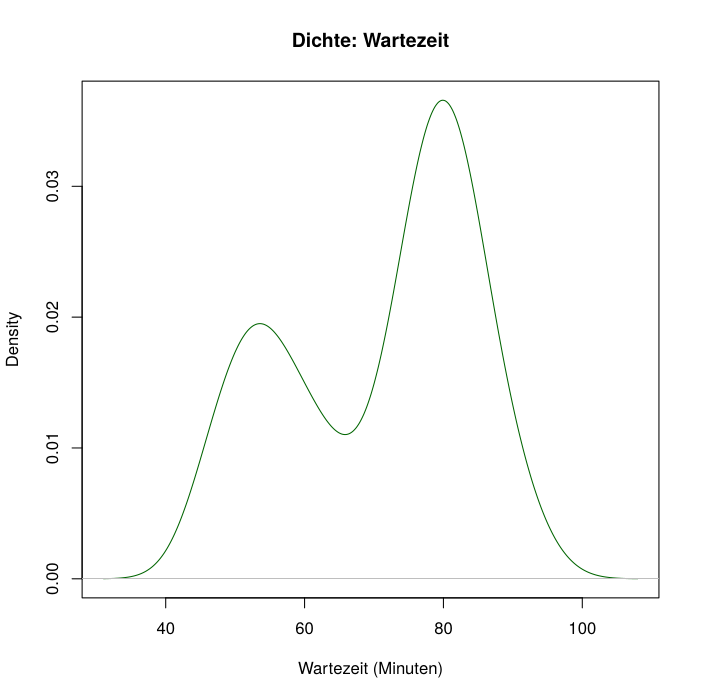 plot(density(faithful$waiting), main = "Dichte: Wartezeit", xlab = "Wartezeit (Minuten)", col = "darkgreen")
