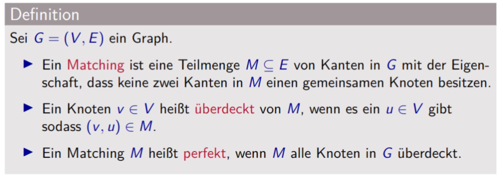 Maximum Matching Perfektes Matching Problem Weighted Bipartite Matchings Blossom Algorithmus Edmonds-Gallai Decomposition Stable Matchings Stable marriage problem Gale-Shapley Algorithm