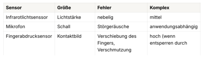 Nenne 5 Sensoren aus Deinem Alltag die nicht in der Vorlesung gelistet sind, zusammen mit der Größe die sie messen.