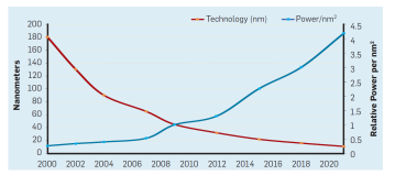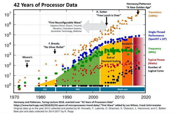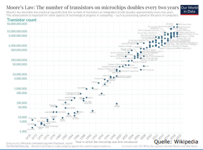 - Dennard Scaling: „Trotz steigender Transistordichte konstanter Energieverbrauch bei gleicher Chipfläche“