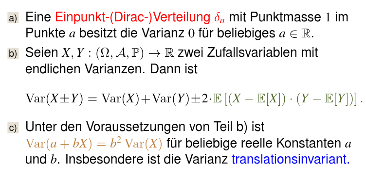 Var(X):=μ2(X)=E[(X−E)2]=E[X2]−E2[X] Momente Empirisch Var(X)=n1∑i=1n(xi−x)2 Varianz der Normalverteilung Varianz der Poisson-Verteilung Varianz der Bernoulli-Verteilung Rechenregeln Herleitung Der Verschiebungssatz